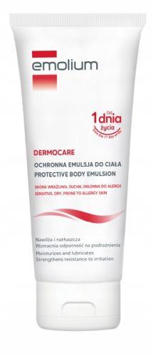 Emolium Dermocare Ochronna emulsja do ciała przeznaczona do pielęgnacji skóry wrażliwej, suchej i wymagającej oraz skłonnej do alergii. Nawilża, natłuszcza oraz wzmacnia odporność na podrażnienia. Może być stosowana do codziennej pielęgnacji skóry dorosłych i dzieci od 1. dnia życia.
