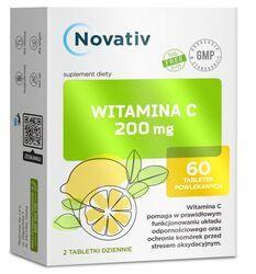 NOVATIV Witamina C 200 mg to suplement diety zawierający witaminę C. Witamina C pomaga w prawidłowym funkcjonowaniu układu odpornościowego oraz nerwowego, a także przyczynia się do utrzymania prawidłowego metabolizmu energetycznego oraz do zmniejszenia uczucia znużenia i zmęczenia. Pomaga w prawidłowej produkcji kolagenu w celu zapewnienia prawidłowego funkcjonowania naczyń krwionośnych, kości, chrząstki, dziąseł, skóry i zębów.