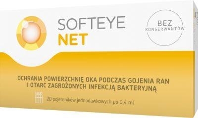 SOFTEYE Net zawiera dwa naturalne polimery: hialuronian sodu i gumę ksantanową. Po zaaplikowaniu produktu do worka spojówkowego łączy się on z filmem łzowym i tworzy przezroczystą, lepką powłokę, która dzięki zmniejszeniu tarcia wywołanego ruchami gałki ocznej i mruganiem ochrania powierzchnię oka i przyspiesza proces gojenia ran i otarć.