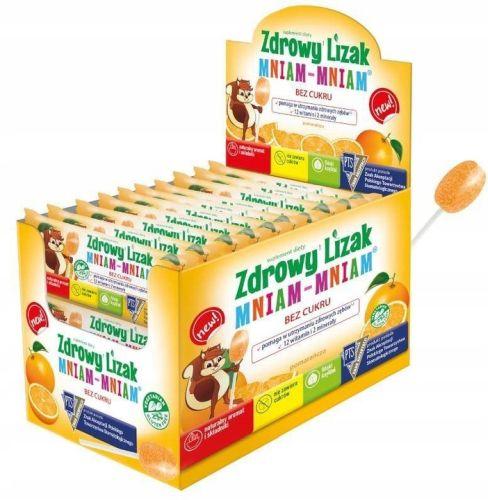 ZDROWY LIZAK MNIAM-MNIAM o smaku pomarańczowym posiada akceptację Polskiego Towarzystawa Stomatologicznego. Podstawowymi składnikami Zdrowego Lizaka Mniam–Mniam są: ksylitol, stewia i izomalt oraz kompleks 12 witamin i 2 minerały. Ksylitol to substancja słodząca pozyskiwana z brzozy. W przeciwieństwie do cukrów jak: glukoza, fruktoza, sacharoza i laktoza nie fermentuje w przewodzie pokarmowym. Działa bakteriobójczo i przeciwpróchniczo, zwiększa mineralizacje zębów. Dzięki stewii ma wyjątkowo niski indeks glikemiczny,dlatego stanowi idealny produkt dla cukrzyków oraz osób z problemami otyłości.