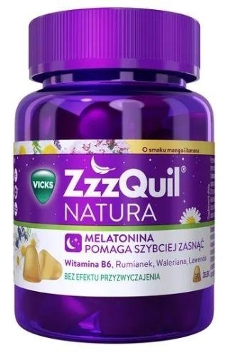 icks ZzzQuil Natura Melatonina o smaku mango i banana to suplement diety w formie żelek rekomendowany do stosowania osobom, które zmagają się z delikatnymi problemami z zasypianiem.